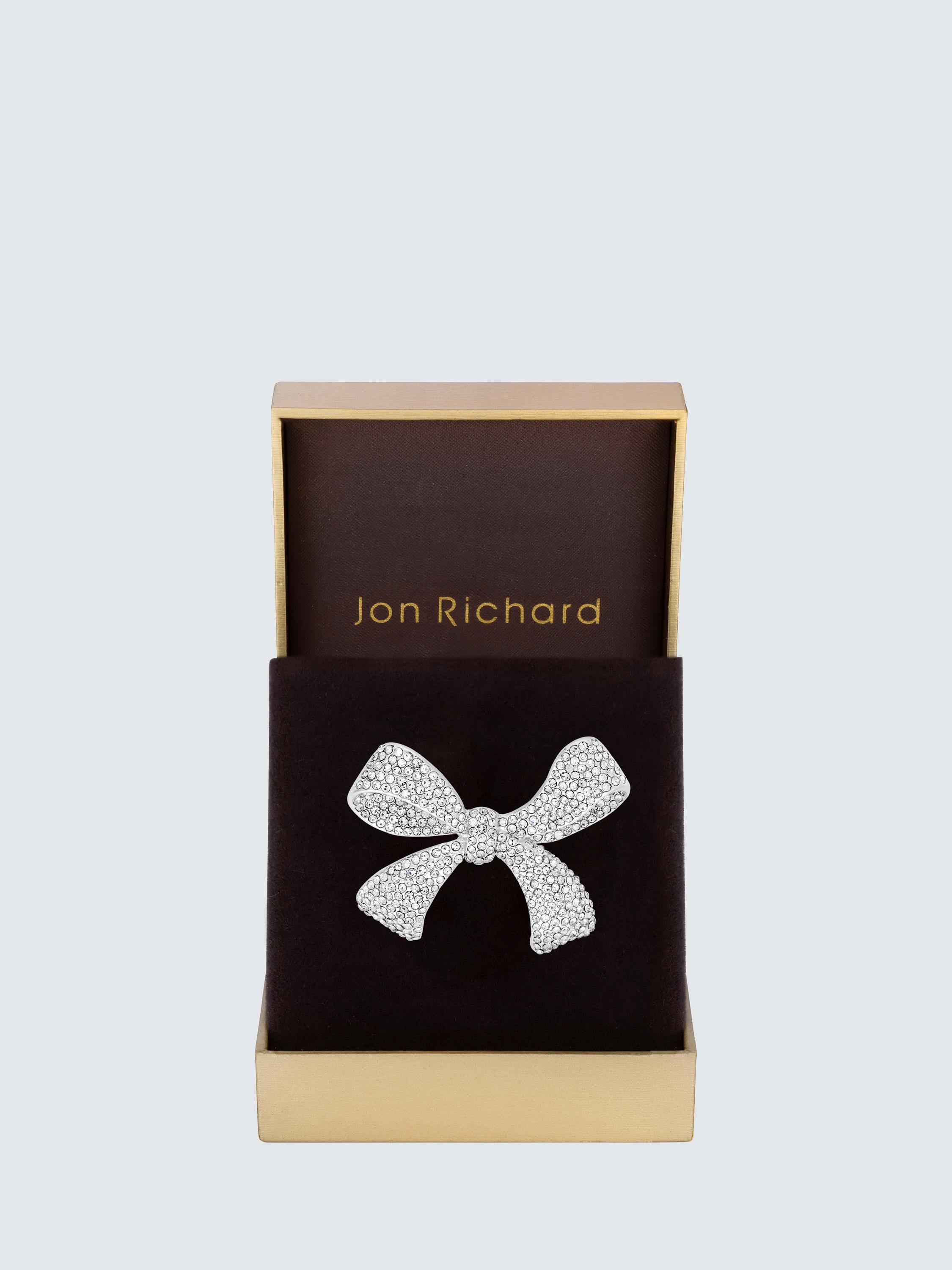 The Jon Richard Crystal Bow Brooch, presented in a polished silver tone, offers elegant accentuation for any formal or smart-casual attire. This detailed jewellery piece features multiple settings showcasing sparkling crystal embellishments, effectively catching ambient light beautifully. It is an ideal accessory for fastening delicate scarves or adorning tailored jackets.