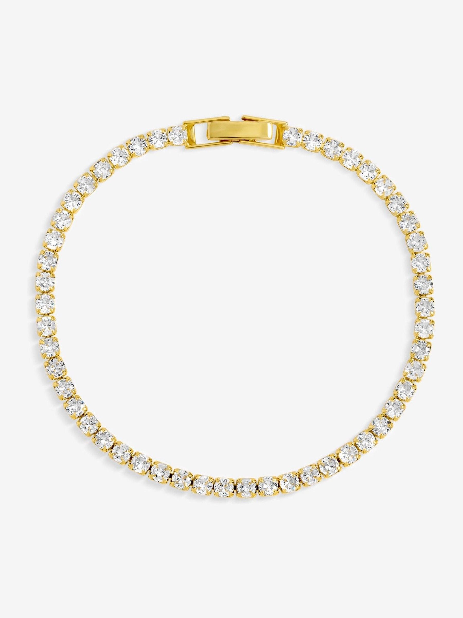 Our Gold Plated and Cubic Zirconia Round Tennis Bracelet is delicately made, designed to bring effortless elegance to any occasion. Featuring shimmering CZ crystals that catch the light from every angle and finished in rich gold plating, this graceful tennis design adds a touch of timeless sparkle. It is the perfect piece to elevate your jewellery collection.