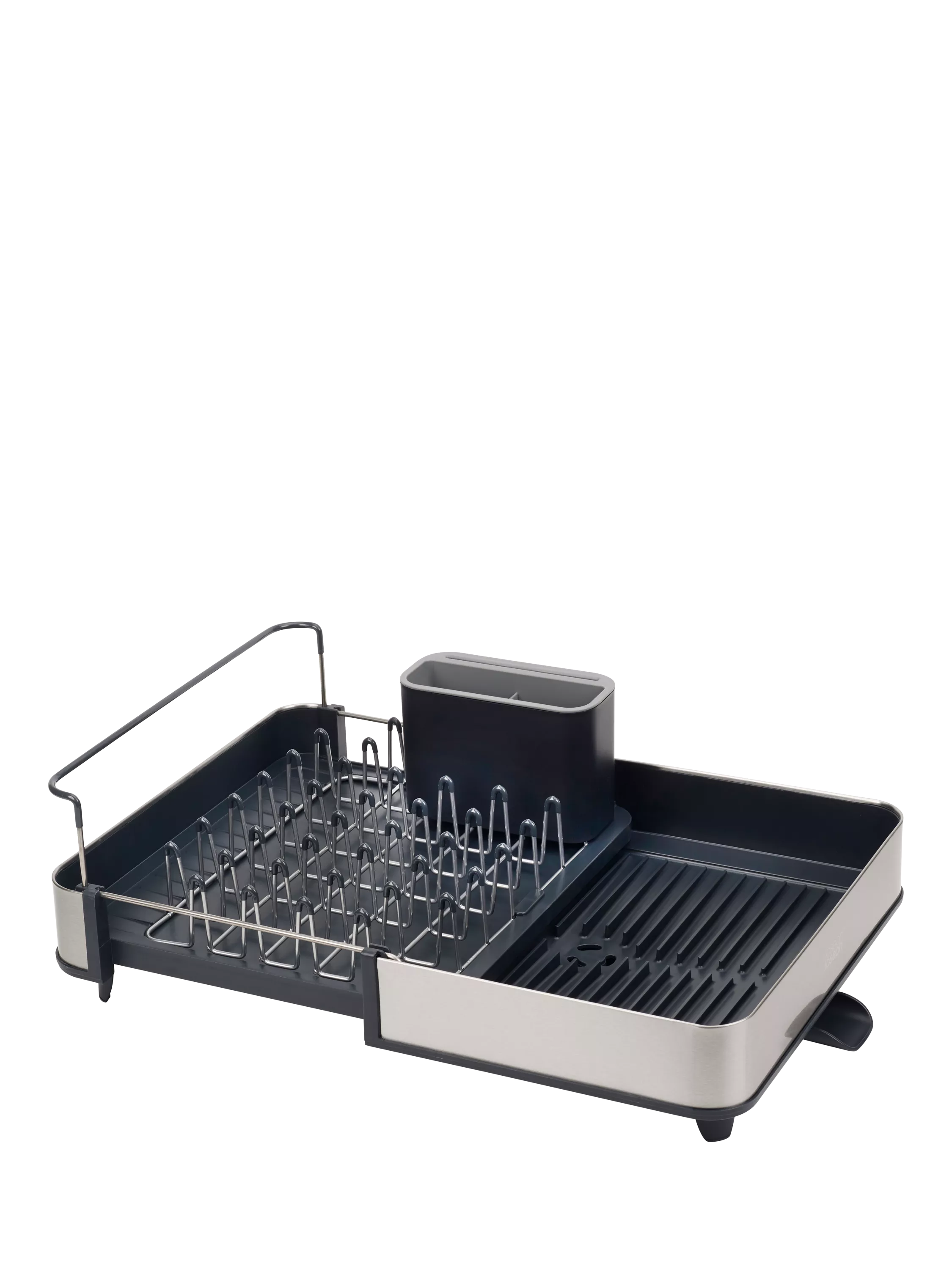 This smart dish rack features a 2-part sliding tray that allows you to easily adjust the size of your draining space when you need more room.