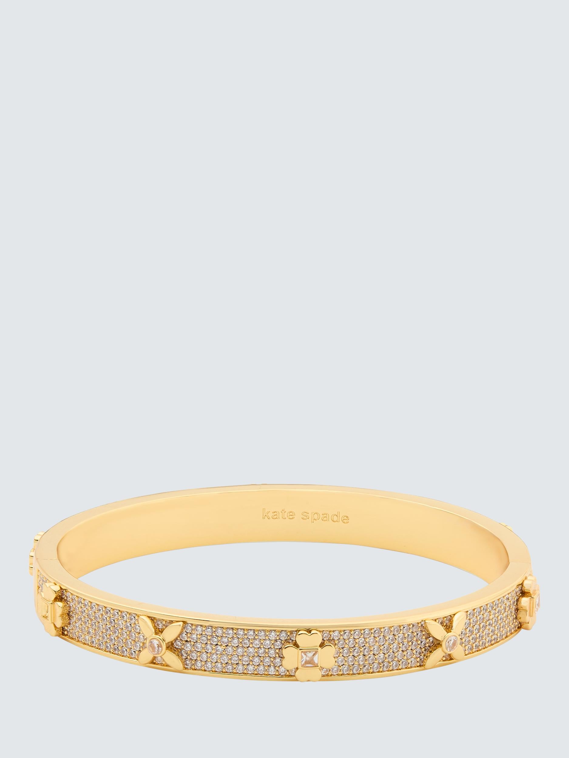 This Kate Spade New York hinged bangle presents a signature spade motif reimagined elegantly as a floral design element. It is heavily embellished throughout with fine, shimmering crystal accents offering continuous sparkle when moved. This clear gold accessory provides refined jewellery suitable for important occasions or elevated daily wear.