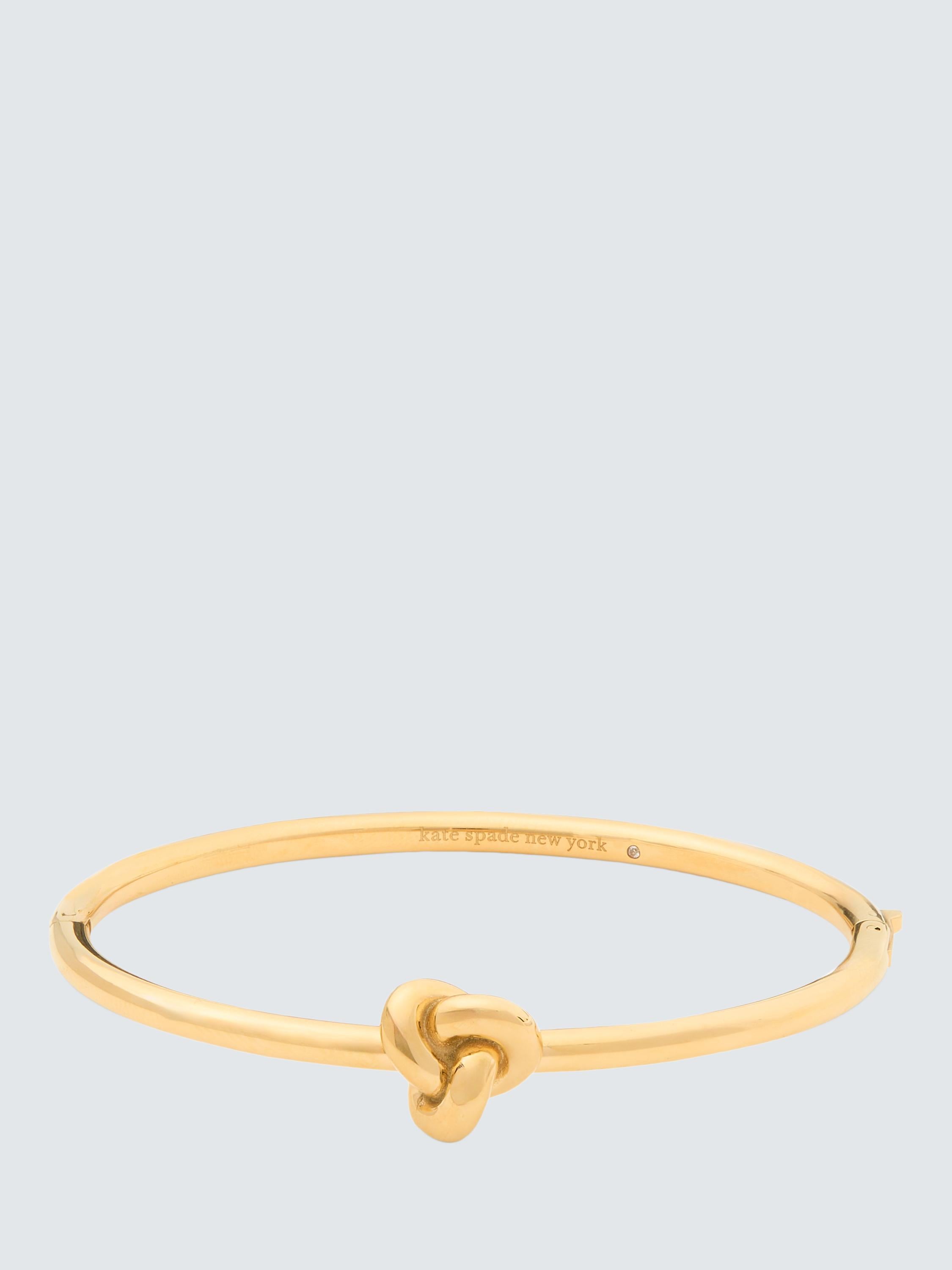 Kate Spade New York presents this sophisticated knot bangle, featuring a polished gold finish perfect for daily sophistication. Its design incorporates sparkling cubic zirconia stones for brilliant light reflection. This essential piece secures safely onto the wrist, enhancing any women's fine jewellery selection today.