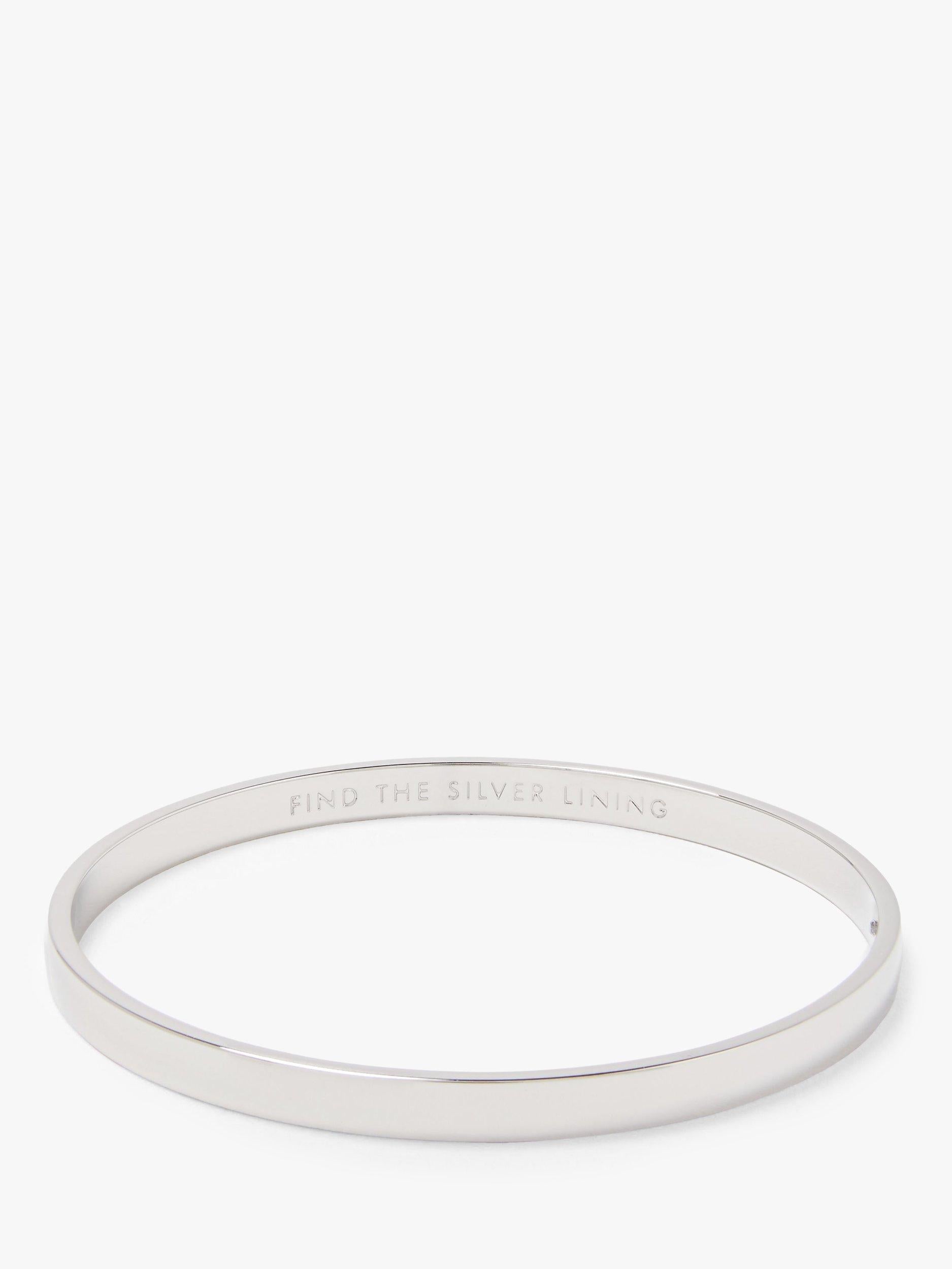 This classic, striking Kate Spade New York bangle features durable rhodium-plated metal construction for lasting shine. The interior band contains the positive message, ‘Find the Silver Lining,’ neatly inscribed upon its surface. This elegant bracelet acts as a helpful, constant reminder to always seek the good in every situation.