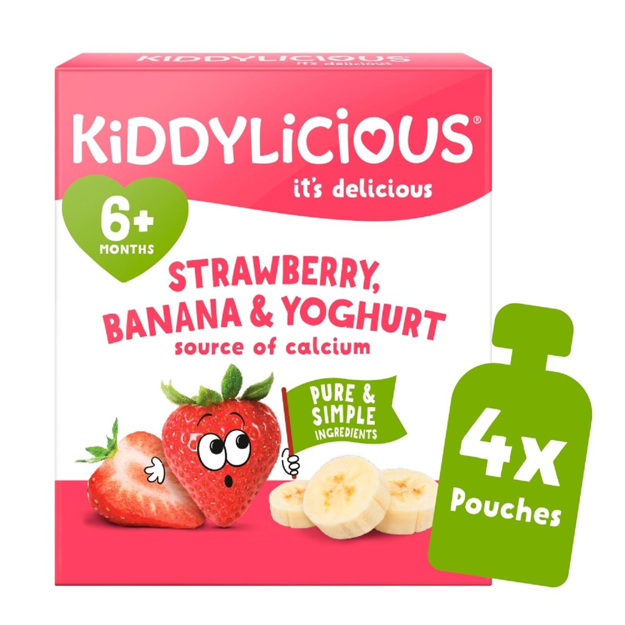 These Kiddylicious pouches offer a smooth, convenient blend of fruit and natural yogurt suitable for babies aged six months and older. This multipack contains four individual servings, making them ideal for on-the-go feeding and easy meal prep. They combine the sweetness of strawberry and banana with a creamy yogurt texture.