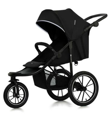 This Kinderkraft 3-wheeled pushchair offers robust performance suitable for various environments. It features a design focused on superior shock absorption and smooth handling across uneven surfaces. The deep black finish provides a modern, practical aesthetic for everyday use.