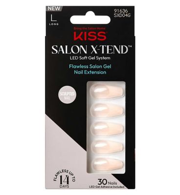 Achieve a salon-sculpted look conveniently at home using the KISS Salon X-tend LED Soft Gel System. These next-level, ready-to-wear gel extensions provide a flawless finish that maintains integrity for up to fourteen days. This system allows users to choose from various styles, lengths, and shapes easily.