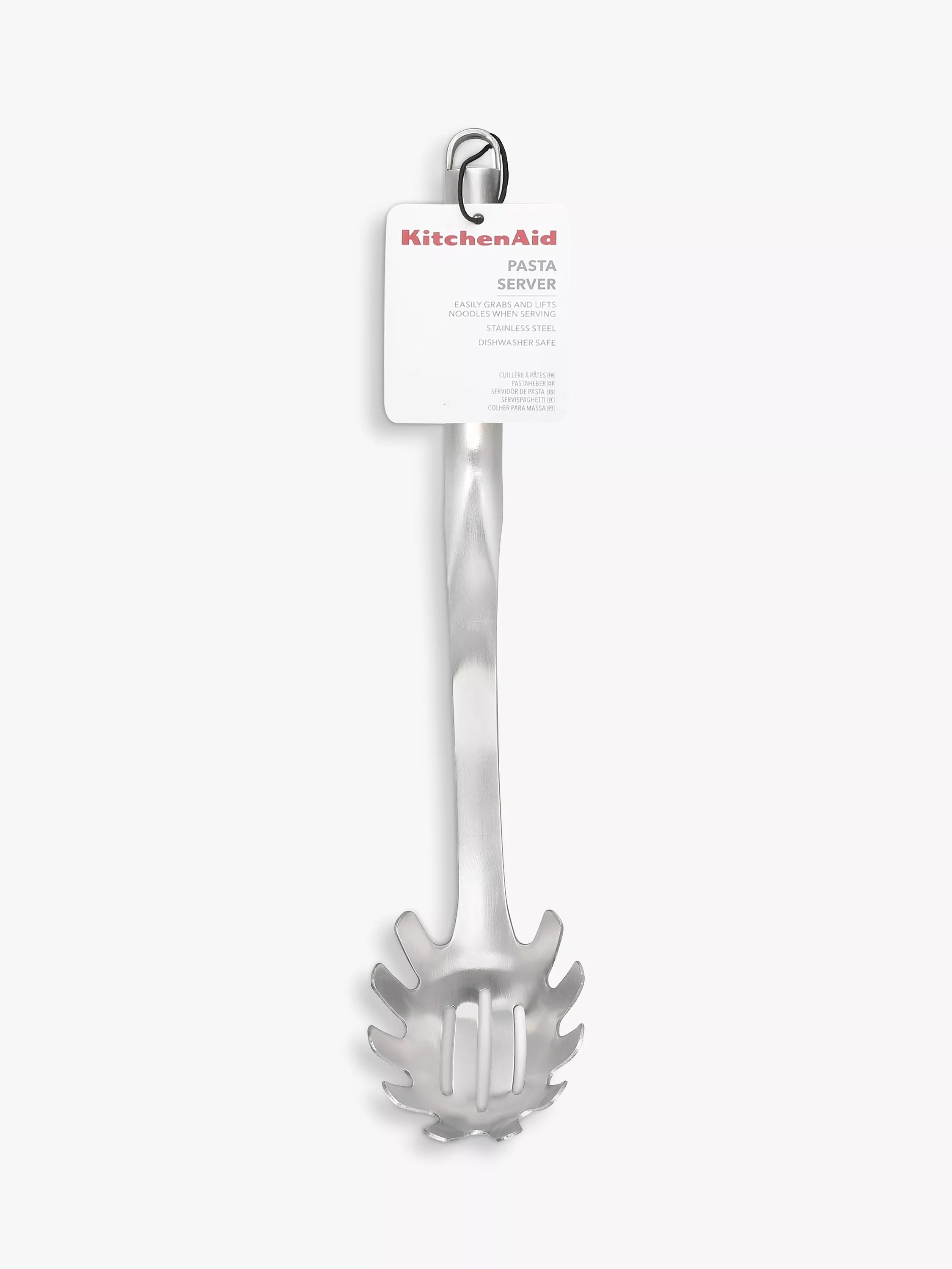 This KitchenAid Premium Pasta Server is a kitchen essential, ideal for scooping and serving pasta. It features tines for grabbing spaghetti and a hole to help liquids drain. It's made from durable stainless steel with a sleek, modern look. Plus, it's dishwasher-safe for easy and hygienic cleaning.