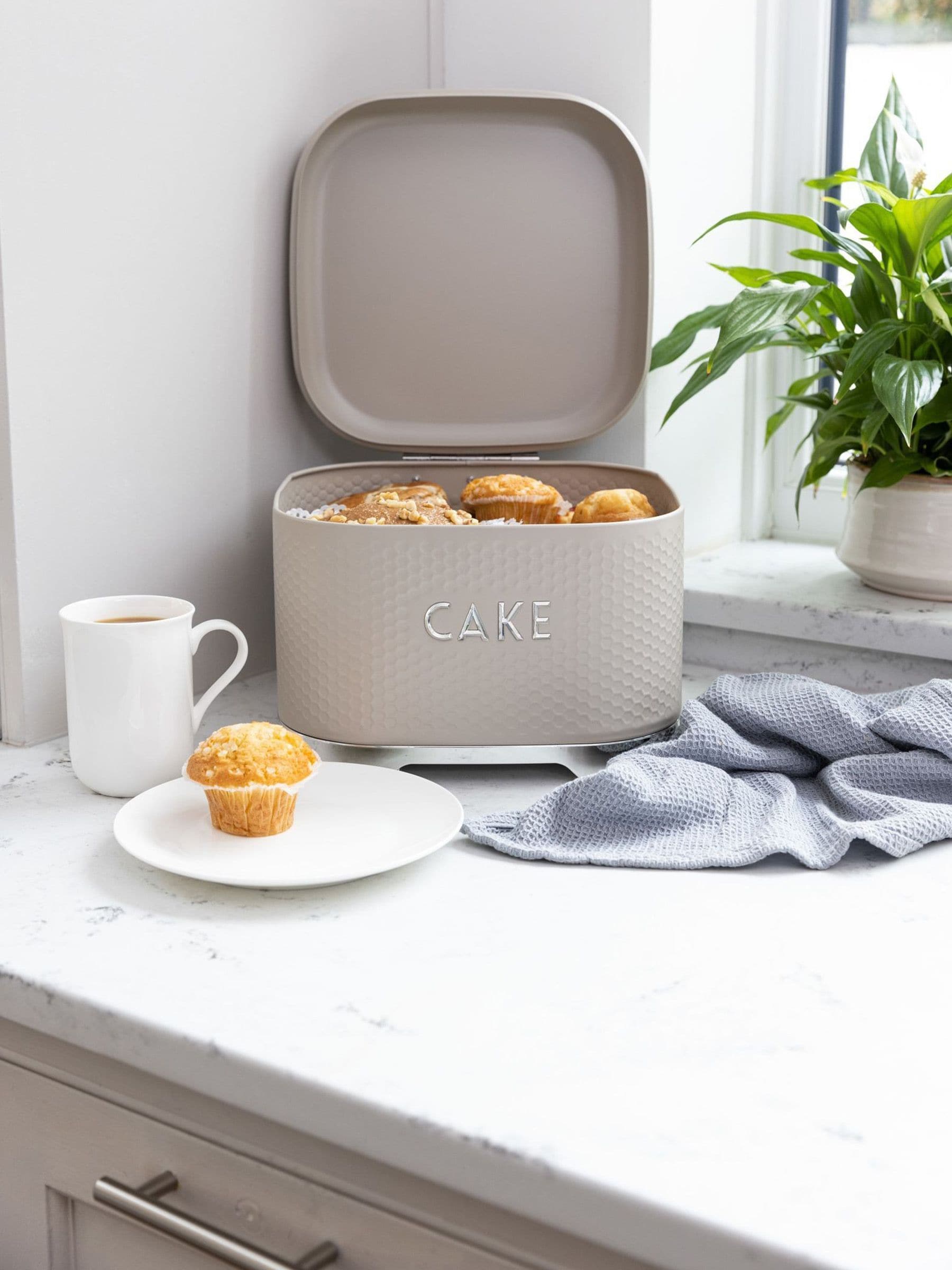It s a retromodern feature piece, with smooth curves and a textured honeycomb finish. the snugfitting hinged lid creates the perfect conditions for cake storage. most cakes will fit just fine, while its square footprint demands minimal space. made of robuststeel, this cake tin comes with a 12month guarantee if you think metal cake storage tins have to be style over function, the lovello textured collection is here to change your mind. this large cake storage box provides the perfect conditions to keep cakes fresh and has an eyecatching retromodern design that will freshen up your dcor too. with its smooth curves and an embossed geometric texture, it s a joy to look at and touch. it s all wrapped up in a latte cream powder coating that will suit any kitchen. use it for all but the largest cakes, as well as other baked goods. this large, tall cake storage tin offers plenty of room for treats while demanding minimal space thanks to its neat, square footprint. it features a hinged lid, too, which ensures a snug fit and keeps your cakes deliciously fresh. as a final touch, it has raised feet in a coordinating chrome effect, which help to keep it stable and protect your worktops. keep it as a feature piece, or mix and match from the lovello textured collection, which offers a range of useful storage solutions in a coordinating modern colour palette. this large square cake storage tin is made of robuststeel and measures 26 x 26 x 20 cm 10. 5 x 10. 5 x 7. 5.
