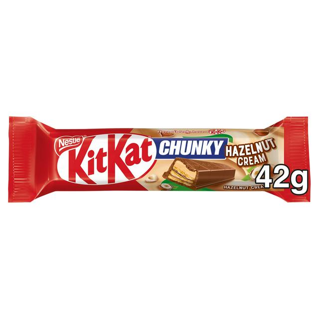 Enjoy the familiar KitKat crunch combined with an indulgent hazelnut flavour experience. This chunky bar features a crisp wafer base enhanced by a creamy hazelnut filling. It is generously coated in thick milk chocolate for an extra layer of satisfaction.