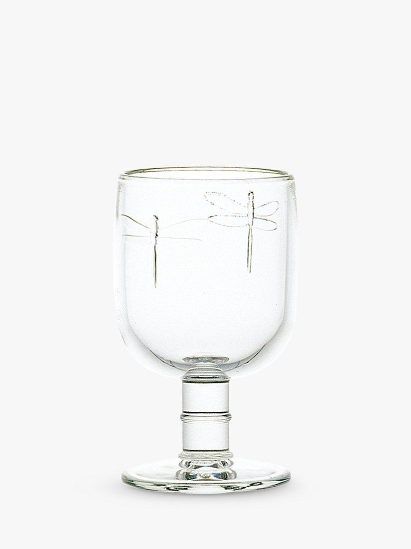 A set of six Libellule wine or water glasses from La Rochère. Made of thick rounded glass that's dishwasher safe, Libellule or 'dragonfly' glassware features raised dragonflies on pressed glass. The resilient glass makes this set ideal for outdoor drinks and parties.