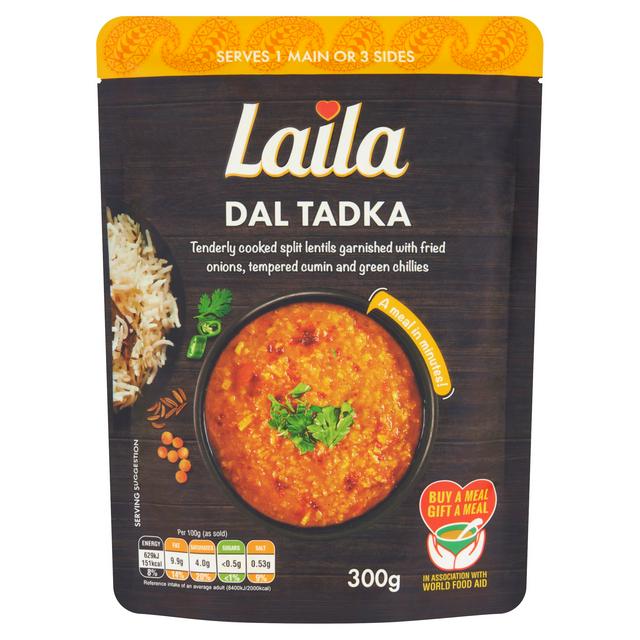 Product details Description Creamy dal of lentils simmered with mild spices and tomatoes. A meal in minutes! Suitable for Vegetarians Tenderly cooked split lentils garnished with fried onions, tempered cumin and green chillies Buy a Meal Gift a Meal In Association With World Food Aid Laila is working in association... Read More