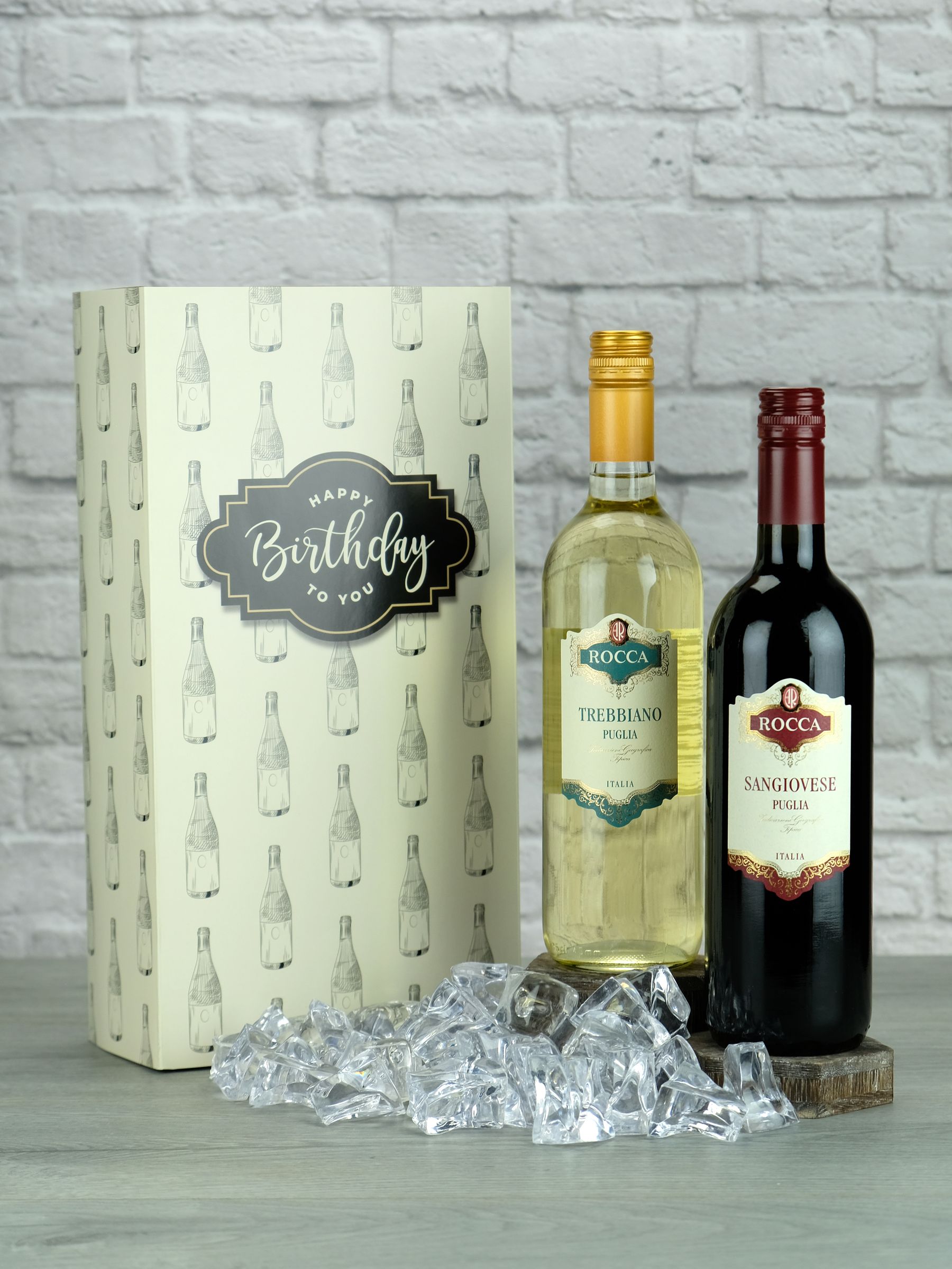 There is no better way to say Happy Birthday than the gift of wine! These two divine Italian wines will be sure to make quite the impression, presented in a beige bottle design, sleeve wrapped gift box. (Rocca Estate Trebbiano Puglia, Rocca Estate Sangiovese Puglia. If any products are unavailable a suitable replacement will be substituted. Volume 2x 750ml, ABV 11% - 12.5%.