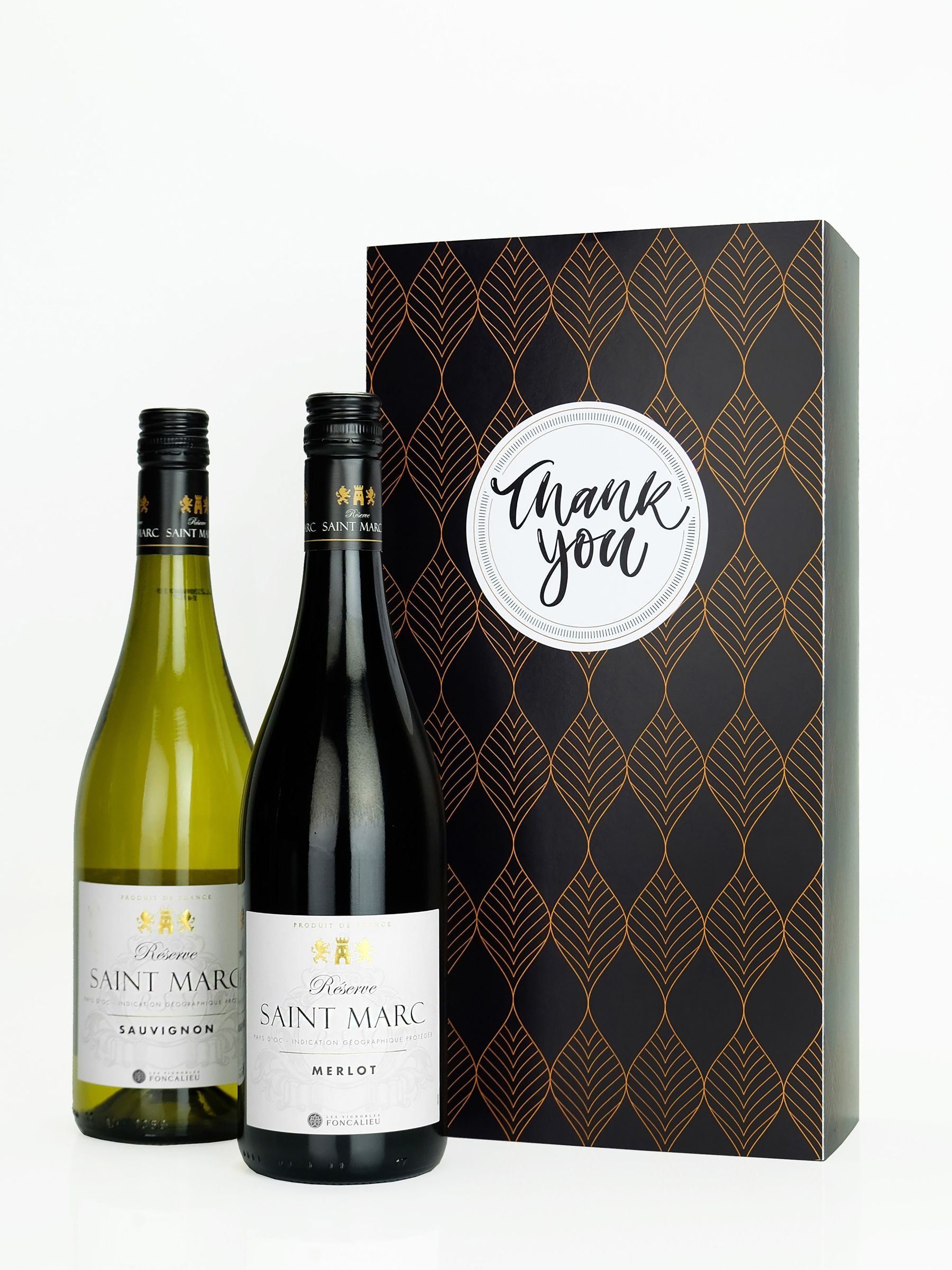 Say thank you with a French Sauvignon and Merlot wine pair presented in a Thank You themed gift box. The Sauvignon has a crisp and refreshing taste with notes of tropical fruits, while the Merlot has a smooth texture with notes of plum and dark fruit. Perfect for expressing your gratitude, this gift is sure to be appreciated by any wine lover. Volume 2x 750ml, ABV 12.0% - 13.0%.
