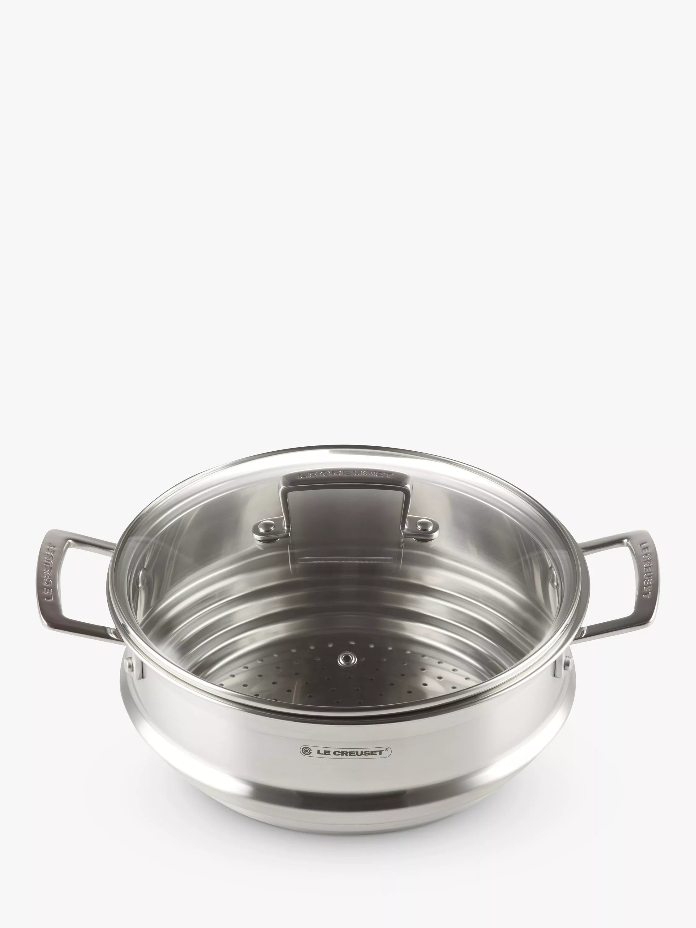 A steamer basket and heat-resistant glass lid for use with a clever stepped-base design that fits all Le Creuset saucepans and casseroles with a 20cm, 22cm or 24cm diameter and can be used with multiple steamer baskets. It's ideal for steaming larger quantities of vegetables, poultry, fish and desserts. Two looped side handles make lifting easy even when full.