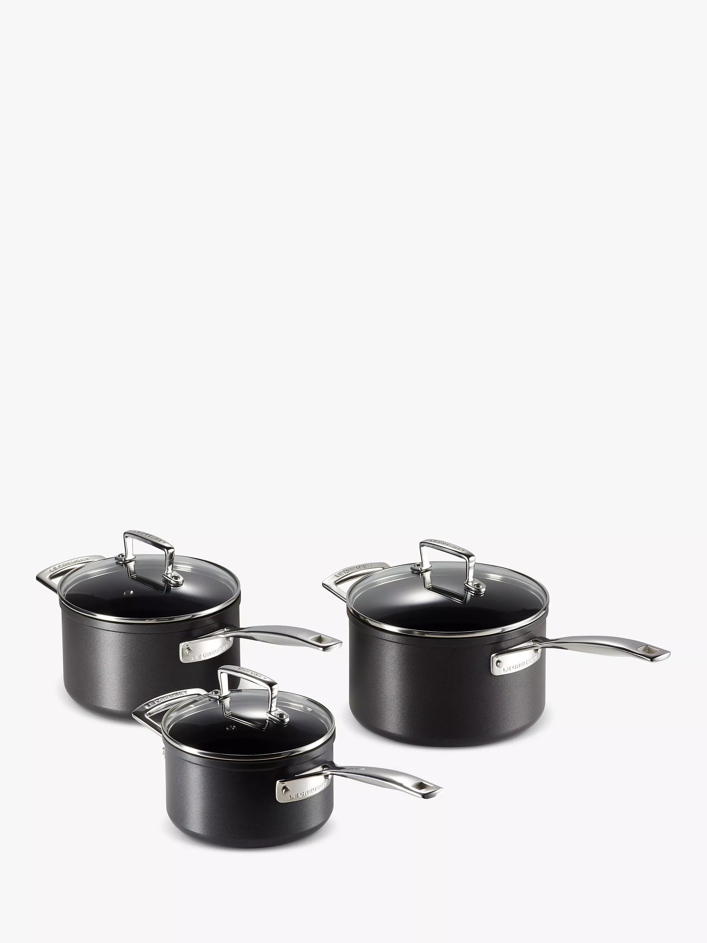 A set of three saucepans and glass lids from Le Creuset's Toughened Non-Stick cookware range. Key sizes include 16cm, 18cm and 20cm. The Toughened Non-Stick range boasts innovative technology from its three-layer reinforced non-stick surface to the induction-compatible base. The cookware is made from high-quality, hard-anodised forged aluminium for excellent heat retention and even heat distribution.