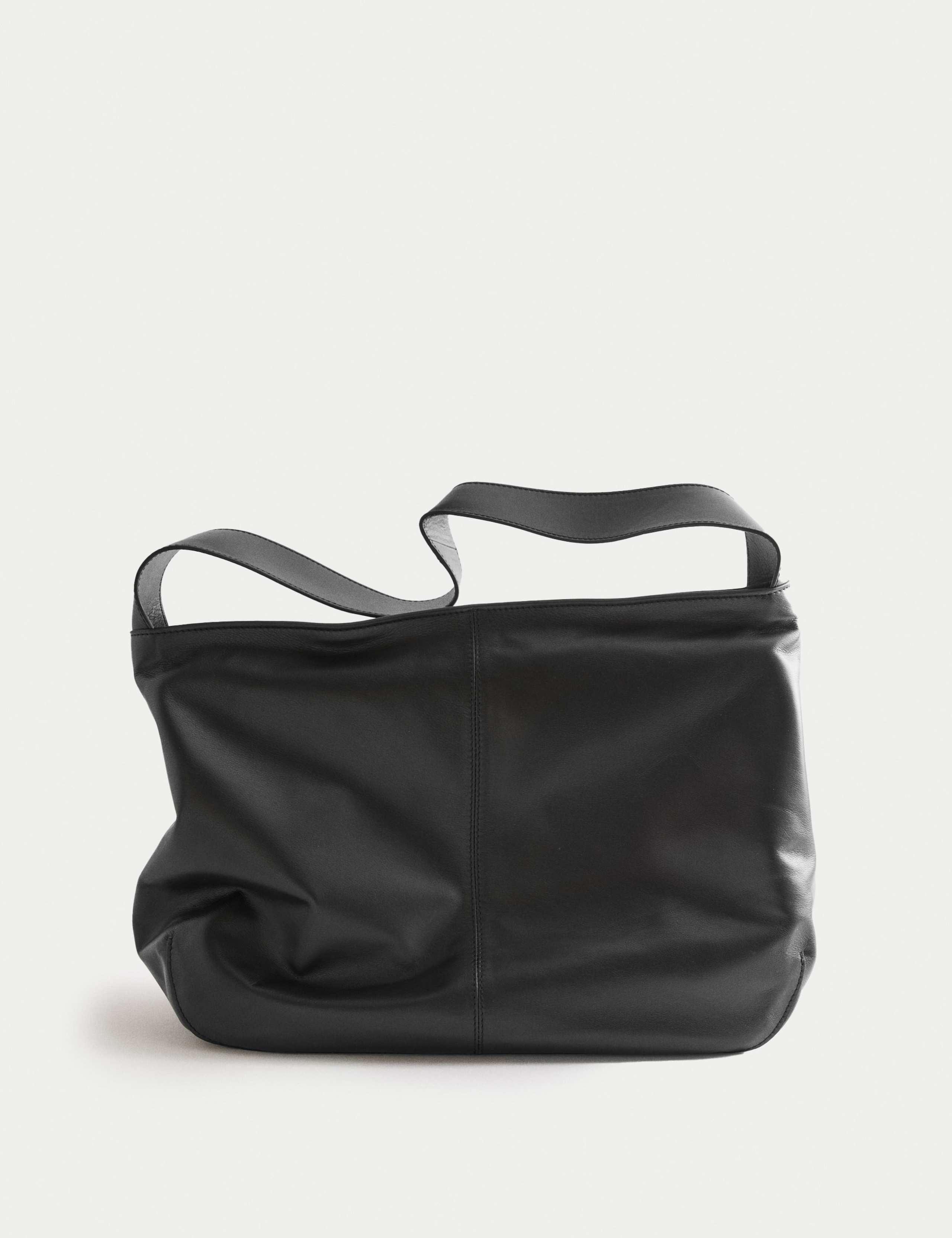 This versatile black accessory is a slouchy shoulder bag crafted from smooth leather, offering a refined and soft structure. It is designed for carrying daily necessities comfortably throughout the day while maintaining an effortless aesthetic. The classic design ensures adaptability across various social and professional settings.