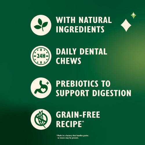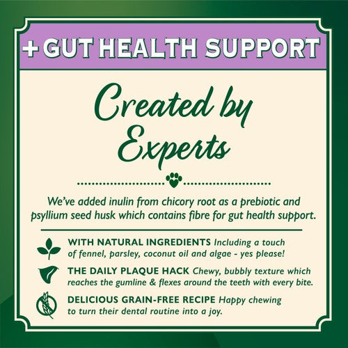 This multipack offers a daily dental solution engineered for small dogs, supporting both oral hygiene and digestive wellness simultaneously. It features a unique chewy bubble texture that actively cleans the gumline while delivering essential gut support ingredients. This plant-based recipe provides a convenient and delicious way to care for your furry family member from teeth to tummy.