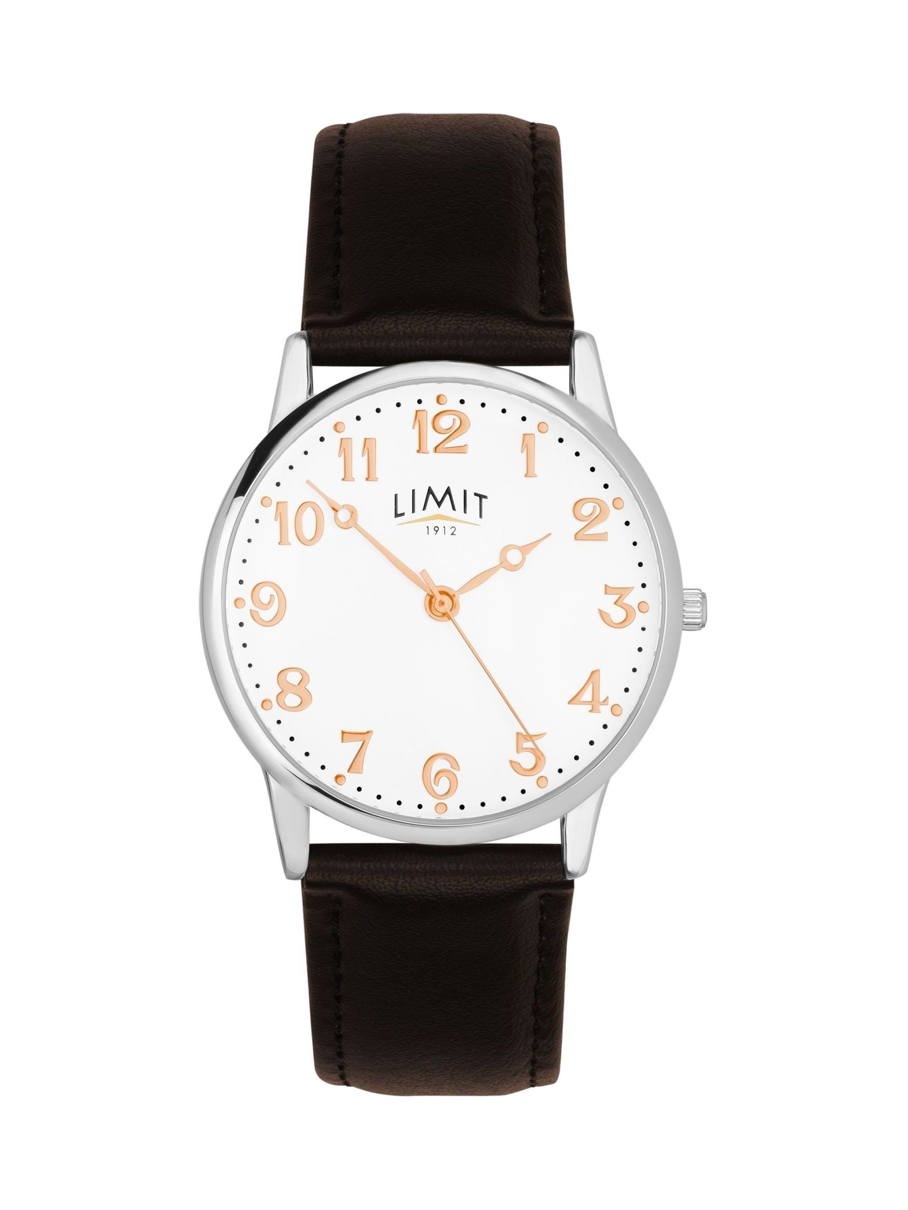 This watch features a round, silver-coloured, alloy case housing a silver/white sandblast dial with rose gold printed figures. Fastened with a dark brown PU strap.