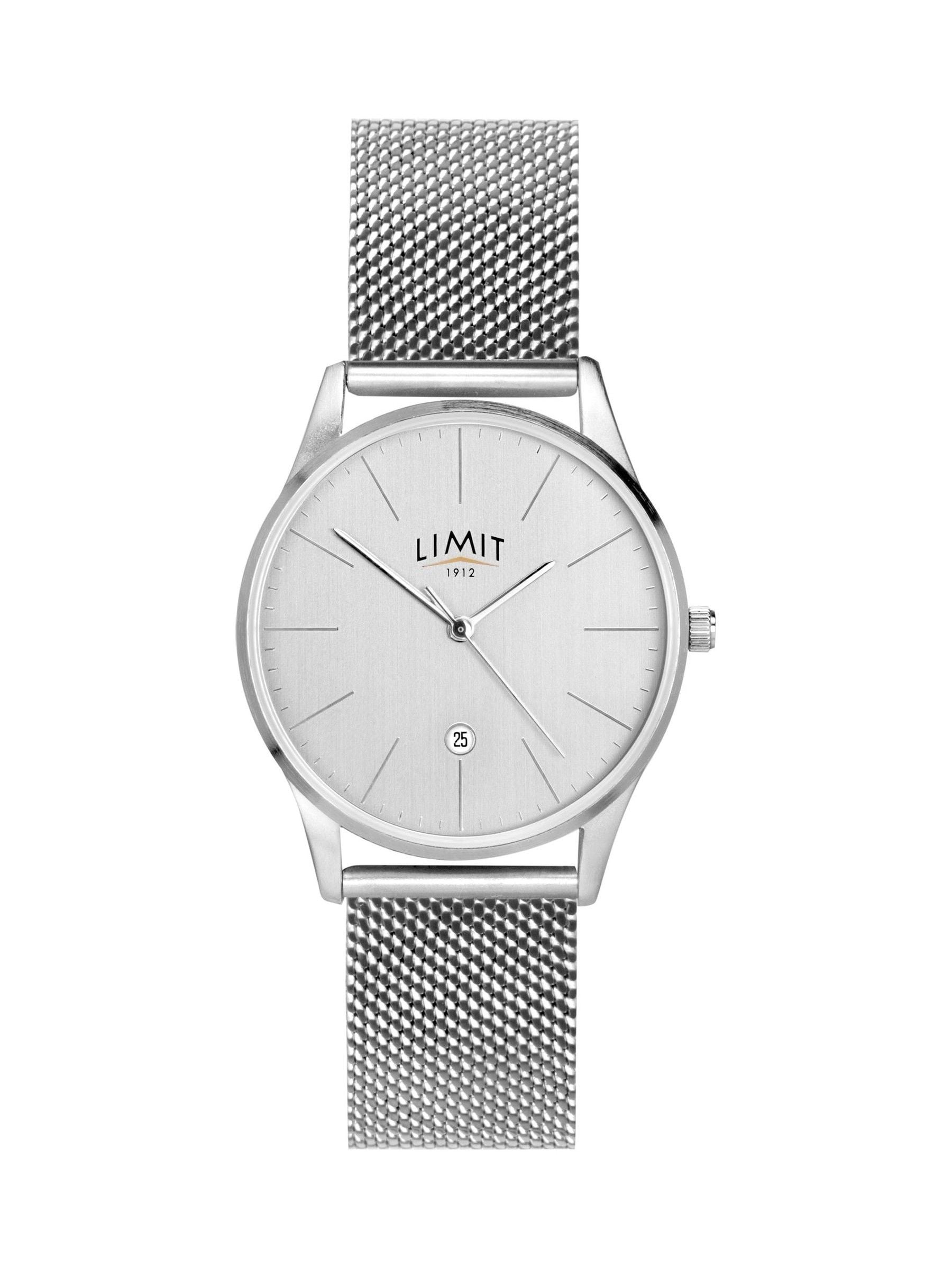 This watch features a round, silver-coloured, alloy case housing a silver brushed dial with printed silver baton hour markers. Fastened with a silver stainless steel mesh bracelet.