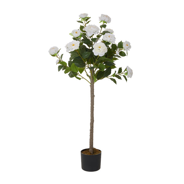 exquisite floral elegance the flowers are crafted from highquality fabric with intricate details replicating the charm of real camellias in full bloom flexible branches supported by an internal iron wire frame the branches can be easily adjusted and shaped to fit your preferred arrangement effortless maintenance no watering sunlight or pruning is needed making it a hasslefree addition to any space specifications overall dimensions 40cmw x 110cmh pot dimensions 15cmdia x 125cmh product type artificial plant material fabric flower plastic iron wire pot material plastic flowers colour white pot colour black pattern camellia tree indooroutdoor indoor assembly required no package content 1 x artificial plant