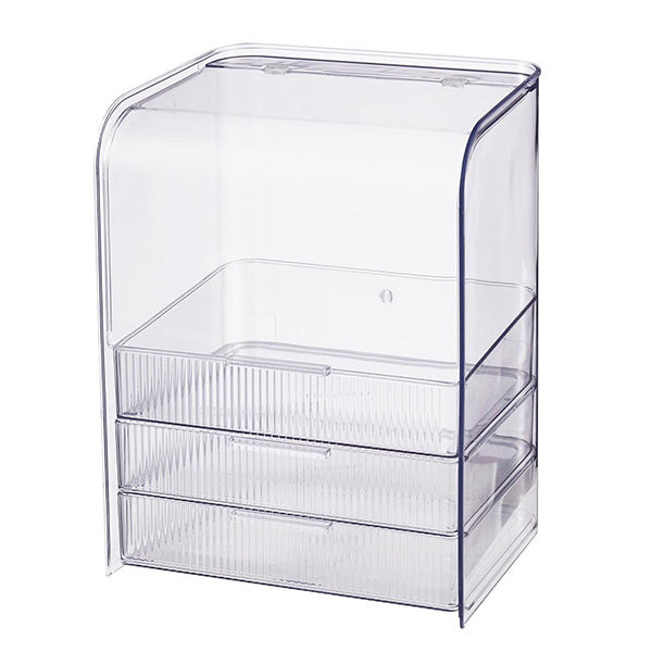 made of quality plastic can withstand scratching and is very durable large storing capacity suitable for high bottles and makeup tools the transparent design makes all the items clear at a glance dimensions 25cm w x 18cm d x 33cm h colour transparent primary material plastic mount type freestanding drawers included yes number of drawers 3 compartments yes package included 1 x makeup organizer