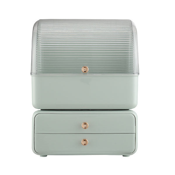 This freestanding plastic organiser offers generous height and ample capacity to neatly house lotions, toners, and various supplies. Its light green finish is complemented by delicate gold knobs, adding an elegant touch to your dressing area. This powerful storage solution maximises desktop space for enhanced tidiness on your vanity.