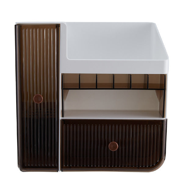 *Efficiently save desktop space and maintain a clutter-free environment *Multiple compartments cater to a variety of storage needs for makeup essentials *The drawers effectively prevent dust accumulation and oxidation Product type: Makeup Organizer Size: 24.5cm W x 19.5cm D x 24.5cm H Material: HIPS+PS+PP Colour: White and Brown Mount Type: Freestanding Number of Drawers: 2 Assembly Required: No Compartments: Yes Package Included: 1 x Makeup Organizer