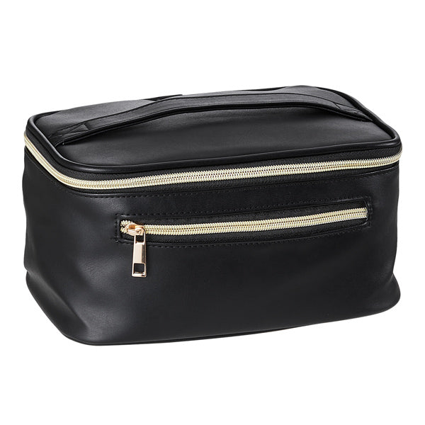 Smooth zipper closure that is easy to maneuver Built-in handle allows you to carry it with ease wherever you go The PU leather exterior is soft to the touch and water-repellent Specifications Overall Dimensions: 23.5cm W x 14cm D x 12.7cm H Material: PU Leather Colour: Black Compartments: Yes Closure Type: Zipper Package Content 1 x Makeup Bag