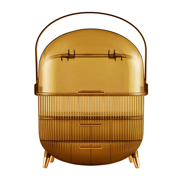 *An equipped handle makes it easy to move around *Channel design and golden finish add textured accents *Golden feet take into account both beauty and stability Product type: Makeup Organizer Size: 25cm W x 18.5cm D x 38cm H Material: ABS Colour: Transparent Yellow Mount Type: Freestanding Number of Drawers: 2 Assembly Required: No Compartments: Yes Package Included: 1 x Makeup Organizer