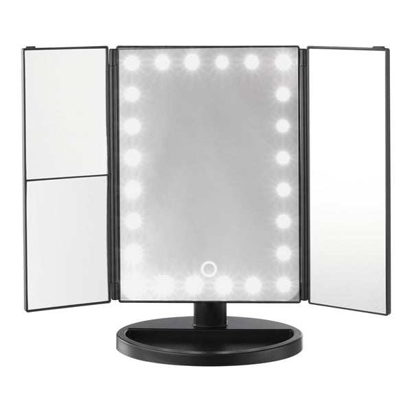 This tri-fold makeup mirror features a clasp for secure closure, ensuring easy storage and space efficiency. Made from premium ABS plastic, it's lightweight yet durable, making it perfect for travel.