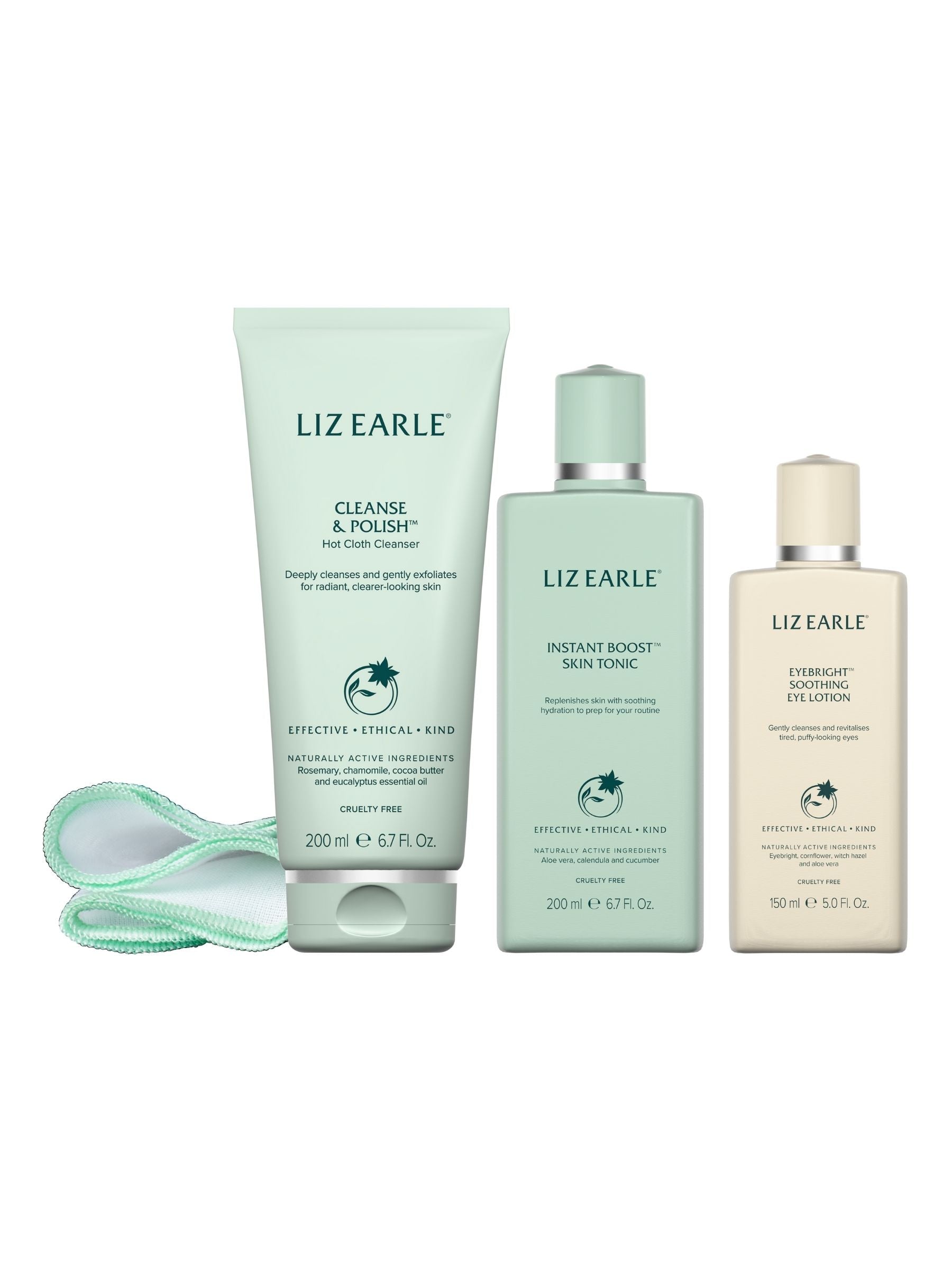 Let your radiance shine with our powerful skincare trio, designed to enhance your daily routine. Instantly boost your skin’s hydration with our bestselling Cleanse & Polish™ Hot Cloth Cleanser, infused with intensely nourishing cocoa butter to soften, smooth and moisturise as you cleanse. Continue with Eyebright™ Soothing Eye Lotion, to gently cleanse and revitalise tired, puffy-looking eyes. Finish your radiance regime with Instant Boost™ Skin Tonic, enriched with aloe vera, calendula and cucumber, to replenish skin with soothing hydration. Why you'll love it: Three full-sized Liz Earle products. Cruelty free and certified under the Leaping Bunny Program. What's inside: Cleanse & Polish™ Hot Cloth Cleanser 200ml, Gentle Face Exfoliator 75ml, Instant Boost™ Skin Tonic 50ml, Superskin™ Moisturiser with Natural Neroli 75ml, 2 Pure Cotton Cloths. 100% cotton cleansing cloth included. (excl. trim & label). Made in India. Wash cotton cloths regularly. We advise replacing your cotton cloths with every purchase of Cleanse & Polish™. Naturally Active Ingredients refers to ingredients that are either to natural or natural origin ISO standard.
