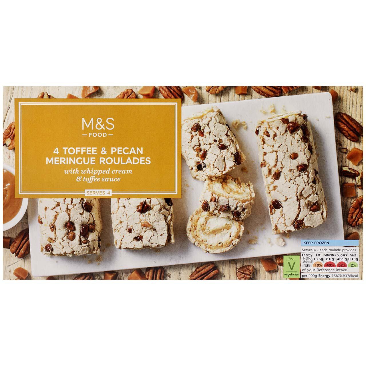 These M&S roulades offer a delightful frozen dessert option ready for serving when entertaining or relaxing. They feature baked meringues that incorporate rich caramelised pecan nut pieces throughout the structure. This convenient four-pack provides an impressive sweet treat for multiple servings.