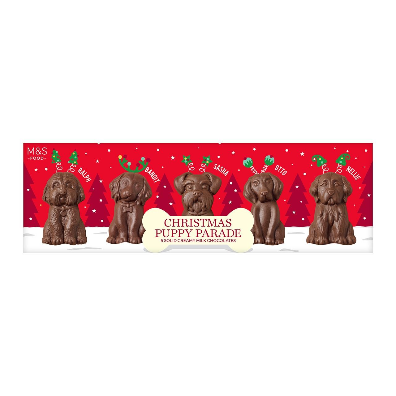 This delightful M&S Christmas Puppy Parade features five solid, creamy milk chocolates shaped like friendly puppies. Each confectionery piece is uniquely decorated with festive accessories, capturing the joy of the season. These individual chocolates make a charming addition to any festive selection or stocking filler this year.