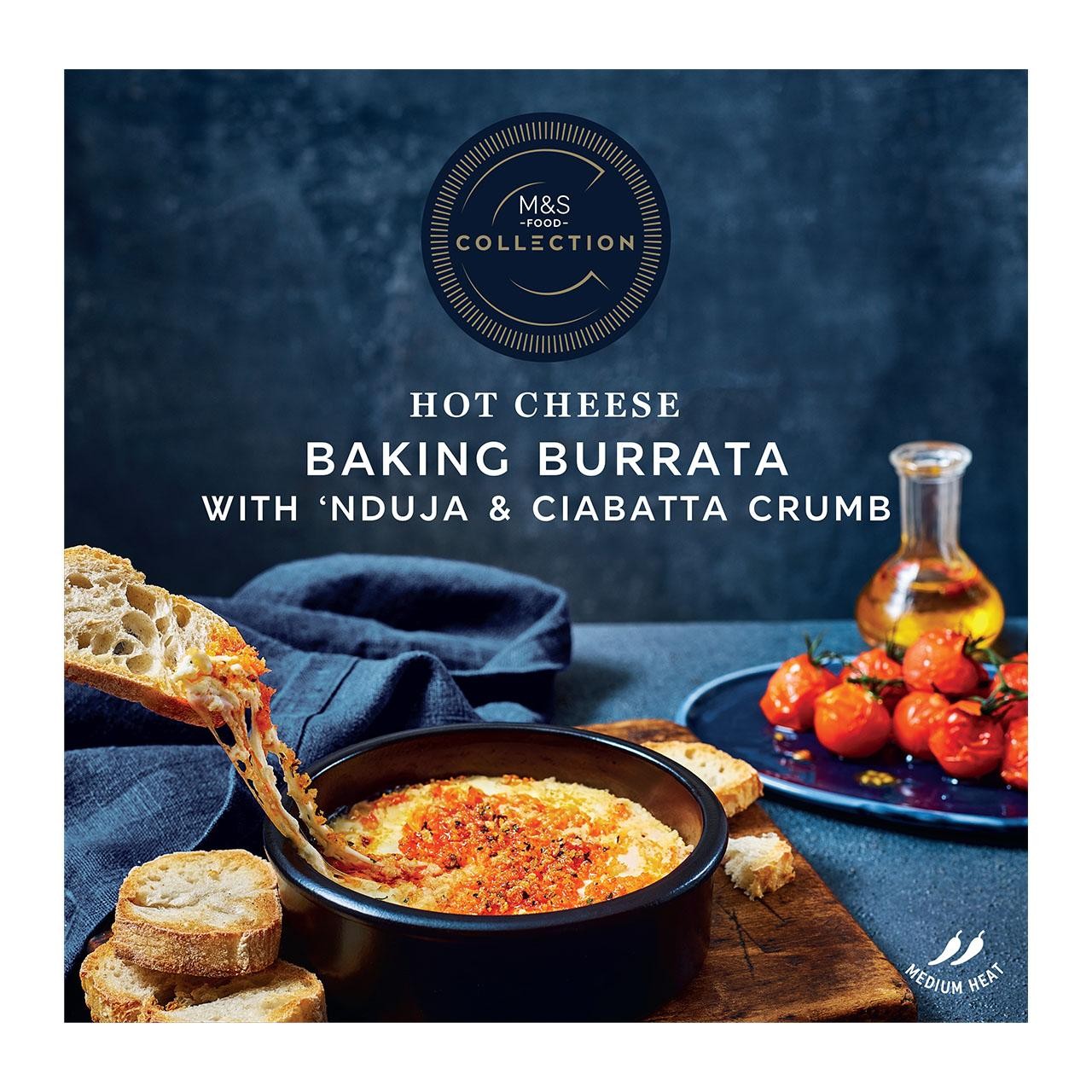 M&S Collection presents an indulgent hot melting burrata perfect for a quick treat. This cheese is centred around spicy Calabrian 'nduja, which is traditionally made using iconic black pig pork. The top layer is finished with a contrasting, crunchy ciabatta crumb for added texture. Simply place it in the oven for 15 minutes until ready to serve warm. This item reflects the Collection range, focusing on exceptional quality and attention to detail for a special experience.