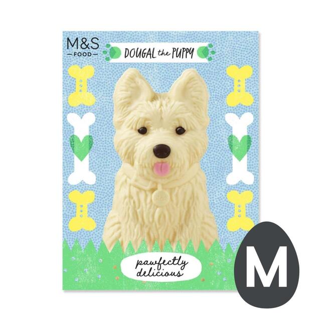 M&S Dougal the PuppyPawfectly delicious decorated hollow white chocolate puppy. After a busy day of digging in the garden for Easter treasure, Dougal loves nothing more than snuggling on the sofa with his family and barking 'hello' at the other dogs on the telly.