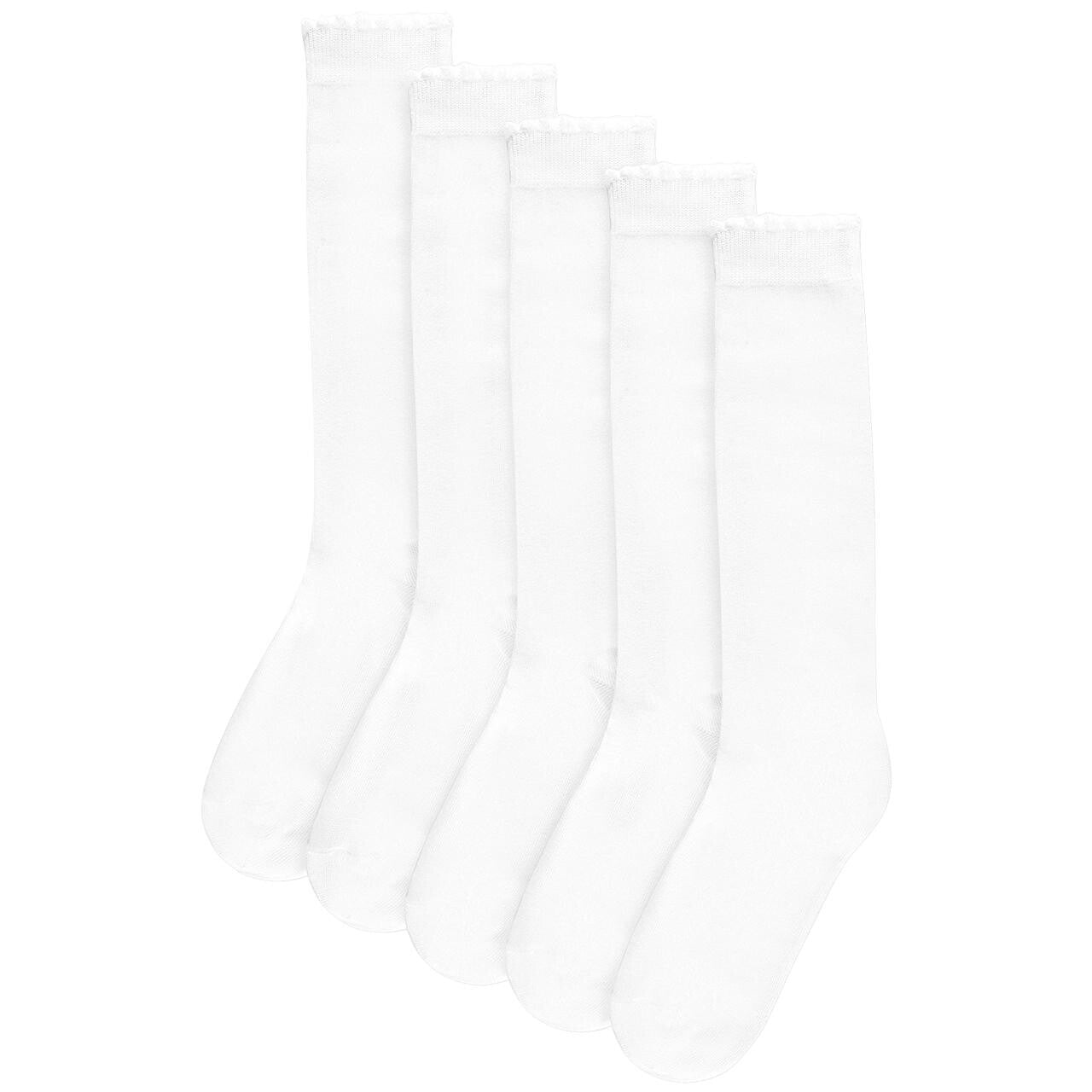 This five pack of white girls' socks provides practical essentials for daily wear throughout the week. Each sock features an elegant scalloped trim, adding a subtle, polished touch to their look. Crafted from a soft cotton mix, these knee high socks ensure comfort and necessary breathability for active children throughout their busy schedule.