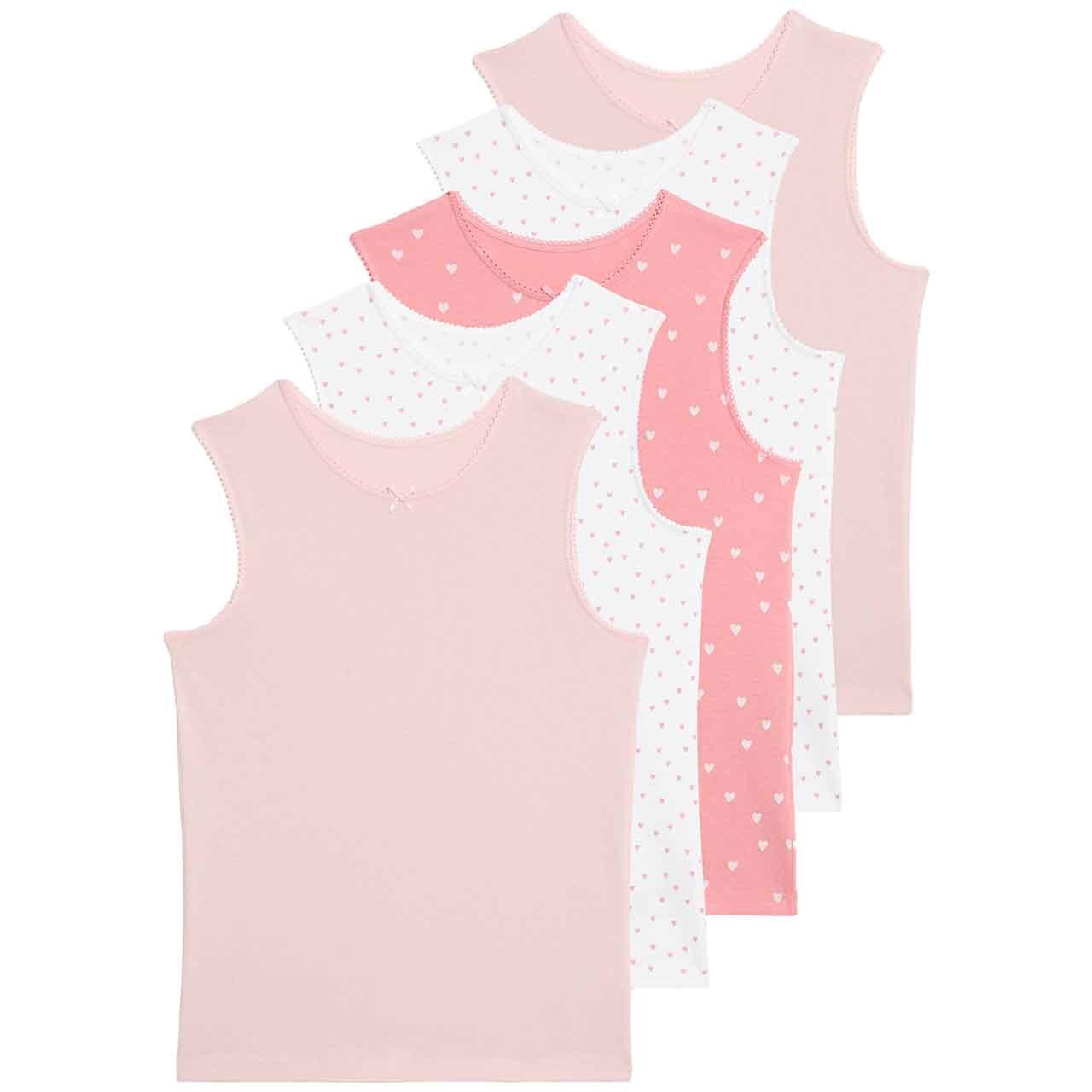 These pure cotton vests are designed to be a comfortable and practical addition to your child's daily essential wardrobe items. This convenient five-pack provides excellent value, offering a variety of plain designs alongside sweet heart prints for versatility. The standard regular fit ensures easy movement and all-day comfort for active wearers.