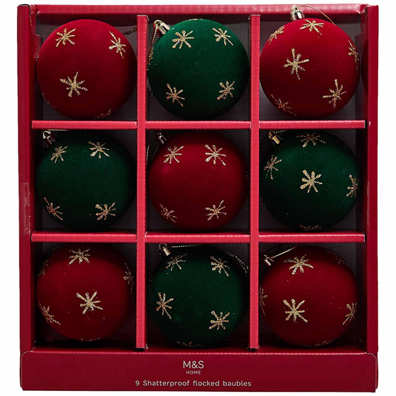 Add classic festive style to your home with this set of nine decorative baubles from M&S HOME. These spherical ornaments feature a rich colour palette of deep red and green, perfect for traditional Christmas settings. The flocked finish provides a tactile, luxurious feel across the entire collection.