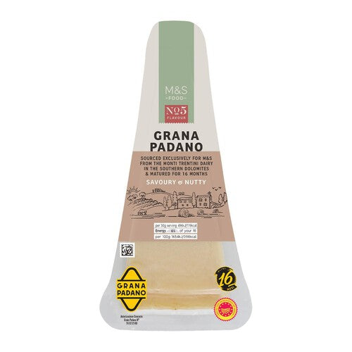M&S Grana Padano represents skilled Italian cheese-making traditions. This authentic cheese is carefully matured for more than twelve months to develop its characteristic profile. The resulting hard texture and deep nutty flavour make it a versatile addition to your culinary selections.