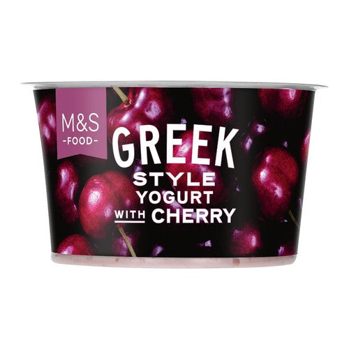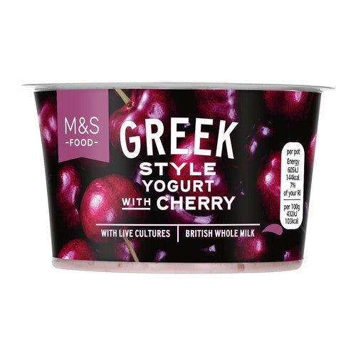 Experience the rich, thick texture of M&S Greek Style Yogurt beautifully layered with sweet cherry pieces. This traditional preparation is enhanced with live cultures, contributing to its depth of flavour profile. This dairy item offers a refreshing taste perfect for any time of the day. Furthermore, this yogurt is carefully crafted using whole milk sourced from British dairy farms.