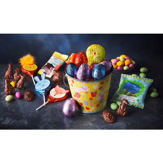 Easter themed egg hunt tin, filled with eight hollow foiled milk chocolate eggs and a chocolate Easter lolly.