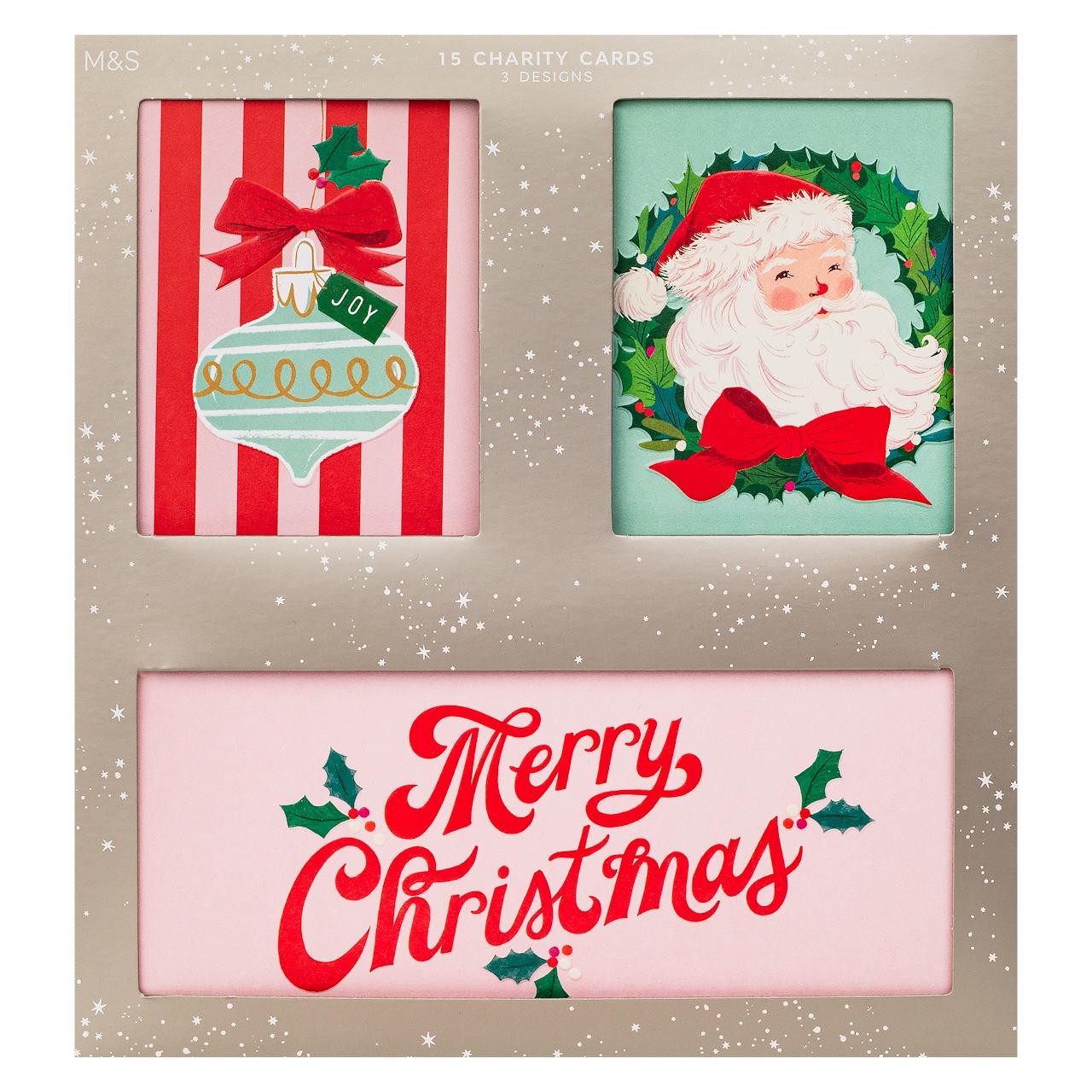 Send bold and colourful festive greetings with this set of 15 M&S Charity Christmas cards. These cards feature three distinct vintage-inspired designs intended to brighten the season for recipients. Purchasing this pack helps contribute towards M&S's commitment to their charity partners.