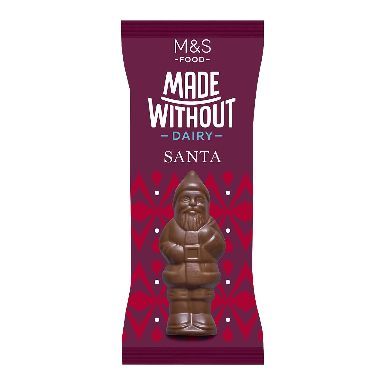 This M&S Food chocolate Santa offers a delightful seasonal treat, perfectly formulated for those avoiding dairy ingredients in their confectionery. The packaging prominently features the 'Made Without Dairy' claim, signalling an inclusive and safe festive option for many consumers. This fun, charming chocolate figure captures the joyful spirit of the holidays in a reliably crafted format from M&S Food.