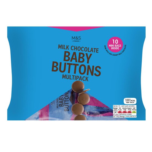 Enjoy these M&S Milk Chocolate Baby Buttons, crafted using their signature creamy milk chocolate recipe. This multipack format provides convenient portion control, making them ideal for on-the-go enjoyment or satisfying smaller treats throughout the week.
