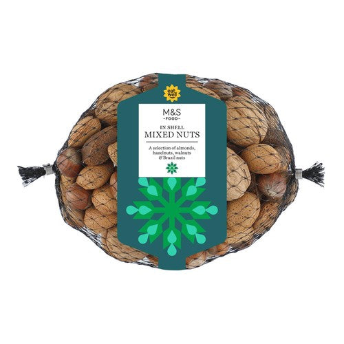 Enjoy this classic assortment of four whole nuts provided by M&S. The mix contains almonds, walnuts, hazelnuts, and Brazil nuts, all supplied in their natural shell. These are perfect for placing in a decorative bowl, accompanied by a nutcracker for easy opening.