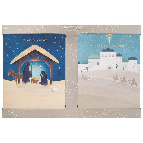 Send warm wishes this festive season using this pack of 10 M&S Charity Christmas cards. These cards feature two distinct religious Nativity Story designs, spreading hope and love for Christmas and the New Year. Purchasing this pack directly contributes to vital charitable giving efforts supported by M&S.