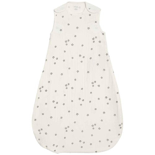 This pure cotton muslin sleeping bag keeps your baby snug on warmer nights. With a 1.0 tog rating, it is suited for room temperatures between 20-24°C. The design features a sweet all-over star print suitable for infants aged 0-6 months. Safety and convenience are addressed through thoughtful construction elements.