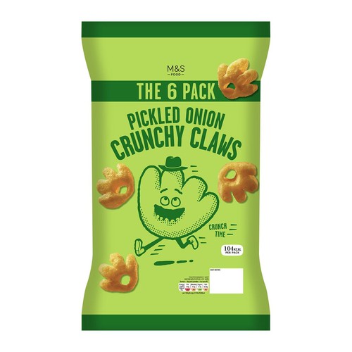 Marks & Spencer presents this multipack of Crunchy Claws, offering a distinctive and popular pickled onion flavour. These savoury snacks are specifically shaped like claws, providing a satisfyingly crisp texture with every bite. This outer packaging contains six individually portioned packs suitable for easy sharing or lunch boxes.