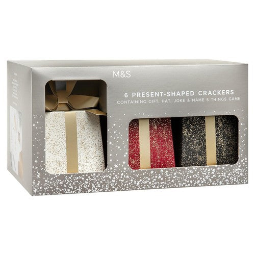 Complete your festive dining arrangements with this set of six M&S present-shaped crackers. These quality crackers are supplied in three distinct visual designs to enhance any seasonal theme. Each one features elegant gold foil detailing across its unique exterior finish.