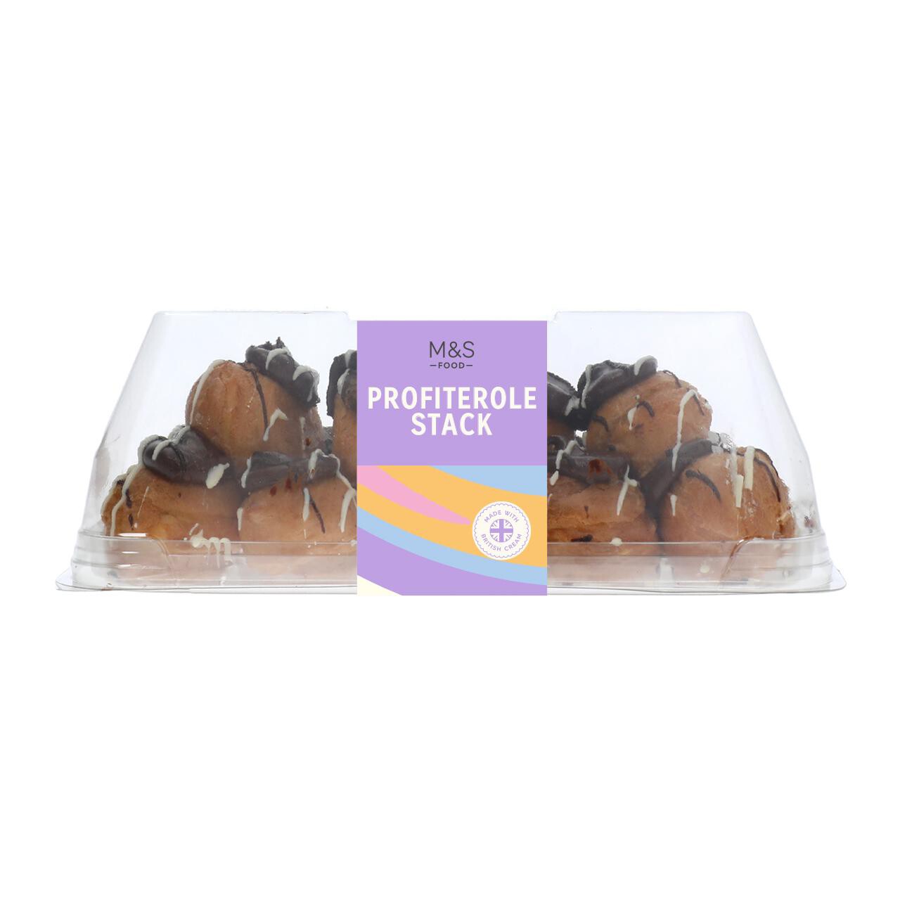 This M&S Profiterole Stack presents a classic chilled dessert assembled for immediate enjoyment. It features delicate, golden choux pastries providing a light, crisp base for the rich layers of filling and topping.