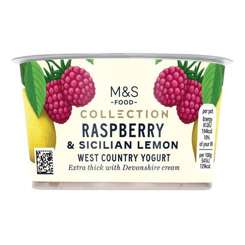 This M&S Collection yogurt combines extra thick Devonshire cream with vibrant fruit flavours. It features a balanced taste profile combining sweet raspberry with sharp Sicilian lemon. This quality dairy product is made with live cultures, ensuring a rich and authentic texture throughout the pot.